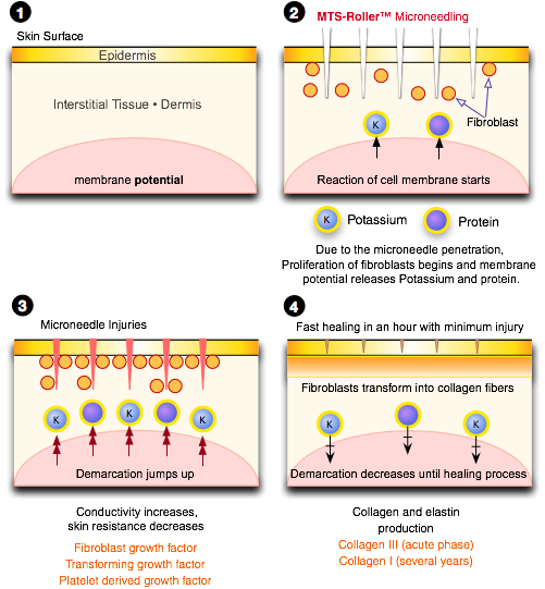 At the heart of Microneedle Therapy System (MTS) is our patented MTS Roller™ – a unique ‘Class I’ supplemental medical device that is ideal for non-surgical and non-ablative treatment of various skin conditions such as aging (wrinkles, stretching), scarring (acne, surgical), and hyperpigmentation. Clinical studies have shown MTS (microneedle therapy system) to be more effective than ablative treatments like laser resurfacing, dermabrasion, and chemical peel and just as effective as non-ablative treatments like IPL, CO2 laser, and Fraxel in stimulating collagen and elastin production to thicken the skin thereby erasing wrinkles and smoothing scars.